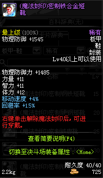 | 15 | (魔法封印)密制钢铁短靴 | *Lv13~21普通地下城怪物掉落 *完成[[魔法封印防具]天才武道家的试炼(3/3)]任务 *使用Lv13~21怪物掉落的设计图进行制作 |
