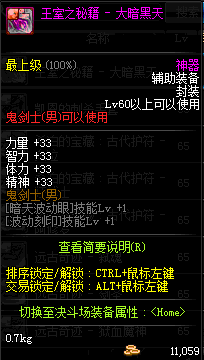 | 鬼剑士 | 神枪手 | 格斗家 | 魔法师 | 圣职者 | 暗夜使者 | 布甲 | 皮甲 | 重甲 | 轻甲 | 板甲 | 饰品 |