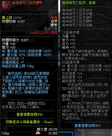 | 85 | 海神谜咒之轻灵腰甲 | *昨日之巴斯顿 掉落 (在远古地下城里出没。) *从NPC鲁特的物品店出售的[海神谜咒防具礼盒]中获得 *船长鲁特 出售 (深海诅咒 : 解咒法×60) |