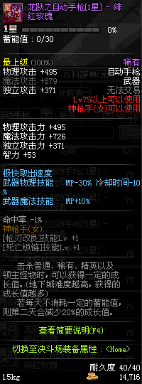 | 75 | 龙跃之自动手枪[1星] – 毁灭者 | *完成二次觉醒任务后可以从NPC小铁柱处获得此道具。 | ||