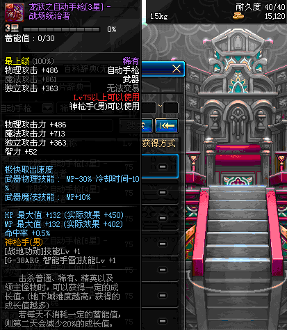 | 75 | 龙跃之自动手枪[3星] – 毁灭者 | *完成二次觉醒任务后可以从NPC小铁柱处获得此道具。 | ||