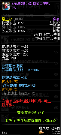 | 45 | (魔法封印)密制转轮手枪 | *Lv45~51普通地下城怪物掉落 *完成[罗斯特的破绽]任务 *使用Lv45~51怪物掉落的设计图进行制作 |