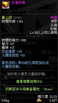 | 30 | 炎息护肩 | *Lv29~36普通地下城怪物掉落 *在加百利的神秘商店购买 |