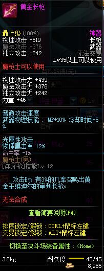 黄金长枪 | *黄金王维迪尔 掉落(黄金矿洞) *在NPC克伦特的物品店购买(阿拉德陨石 ×150) |