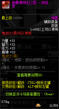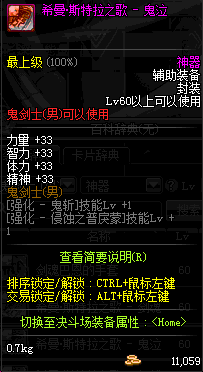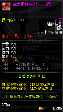 | 鬼剑士 | 神枪手 | 格斗家 | 魔法师 | 圣职者 | 暗夜使者 | 布甲 | 皮甲 | 重甲 | 轻甲 | 板甲 | 饰品 |