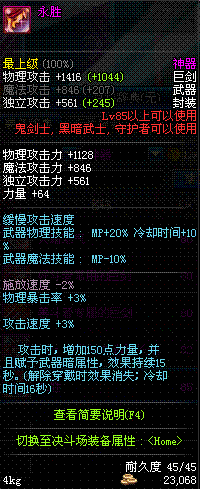 | 85 | 阳剑 - 干将 | *Lv84~91深渊地下城怪物掉落 *攻坚队完成安徒恩团队模式的[消灭安徒恩]任务时,获得的奖励。 |