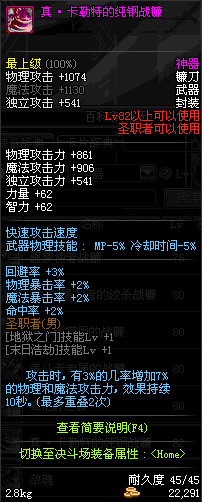 | 82 | 真 · 卡勒特的纯钢战镰 | *设计图(70LV以上普通地下城 登场的NPC加百利 出售) *卡勒特的纯钢战镰 → 用远古神器装备进化书升级(NPC船长鲁特 出售) |