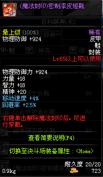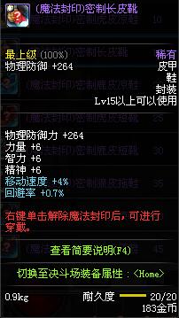| 15 | (魔法封印)密制长皮靴 | *Lv13~21普通地下城怪物掉落 *完成[[魔法封印防具]天才武道家的试炼(3/3)]任务 *使用Lv13~21怪物掉落的设计图进行制作 |