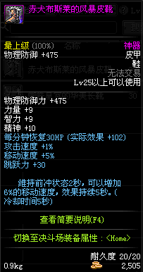 | 25 | 赤犬布斯莱的风暴皮靴 | *赤犬布加迪 掉落(赫顿玛尔旧街区) *在NPC阿尔伯特·伯恩斯坦的物品店购买(阿拉德陨石×37) |