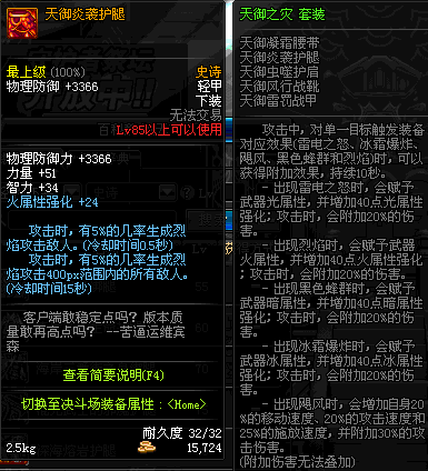 | 85 | 天御炎袭护腿 | *Lv84~91深渊地下城怪物掉落 | 天御之灾 套装 | |