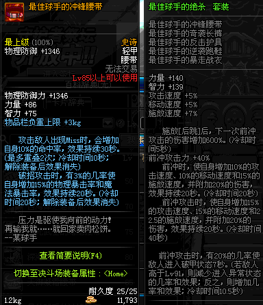 | 85 | 最佳球手的冲锋腰带 | *Lv84~91深渊地下城怪物掉落 | 最佳球手的绝杀 套装 | |