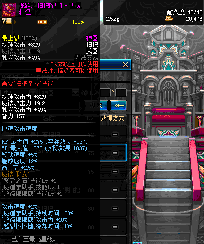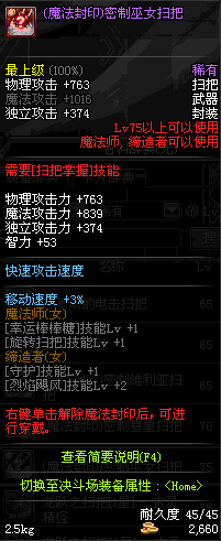 | 75 | (魔法封印)密制巫女扫把 | *Lv75~81普通地下城怪物掉落 *完成[调查紫雾团]任务 *使用Lv75~81怪物掉落的设计图进行制作 |