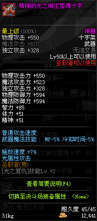 | 50 | 精铸的光之城主誓魂十字 | *领主-光之城主赛格哈特 掉落(极光幻境) *在NPC敏泰的物品店购买(阿拉德陨石×285) |