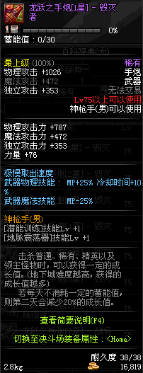 | 75 | 龙跃之手炮[2星] – 毁灭者 | *完成二次觉醒任务后可以从NPC小铁柱处获得此道具。 | ||