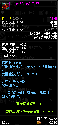| 20 | 火蚁兹利恩的手炮 | *堕落蚁后梅莲娜 掉落(蚁后的巢穴) *在NPC阿尔伯特·伯恩斯坦的物品店购买(阿拉德陨石×15) |