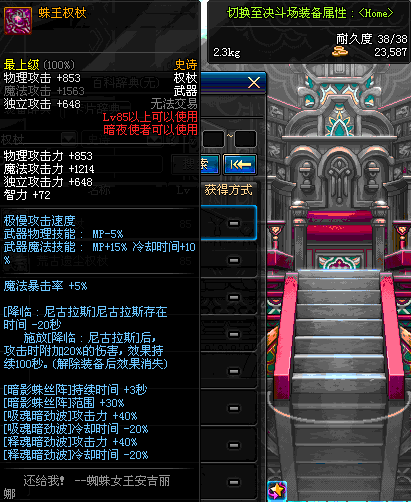 | 85 | 蛛王权杖 | *Lv84~91深渊地下城怪物掉落 *攻坚队完成安徒恩团队模式的[消灭安徒恩]任务时,获得的奖励。 |