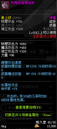 | 50 | 利库的霜寒战斧 | *寒冰巨人利库 掉落(黑色雪山) *在NPC敏泰的物品店购买(阿拉德陨石×285) |