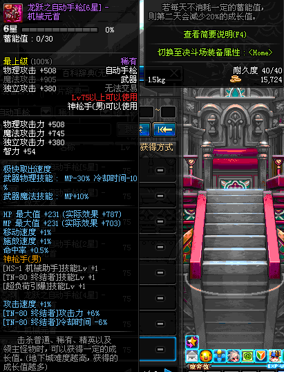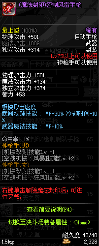 | 75 | (魔法封印)密制风雷手枪 | *Lv75~81普通地下城怪物掉落 *完成[调查紫雾团]任务 *使用Lv75~81怪物掉落的设计图进行制作 |
