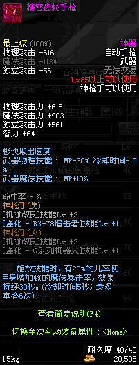 | 85 | 精密齿轮手枪 | *全金属机甲 掉落(地下城: 钢铁之臂) *在NPC猎手伯恩的物品店购买(遗忘陨石×600) |